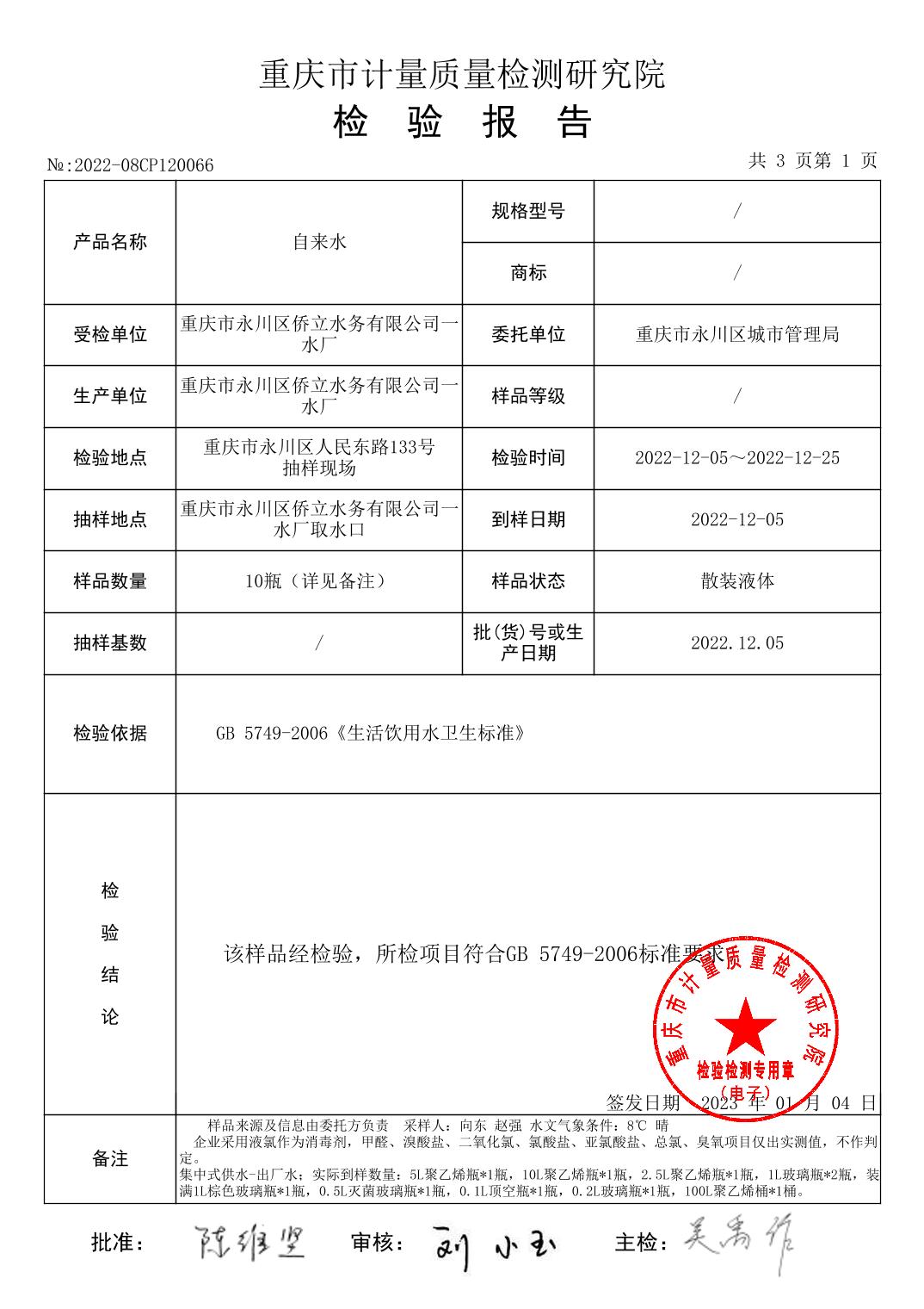 | 标题: | 重庆市永川区城市管理局关于2022年12月永川城区水质(出厂水、管网水)检测报告的公示 | ||||