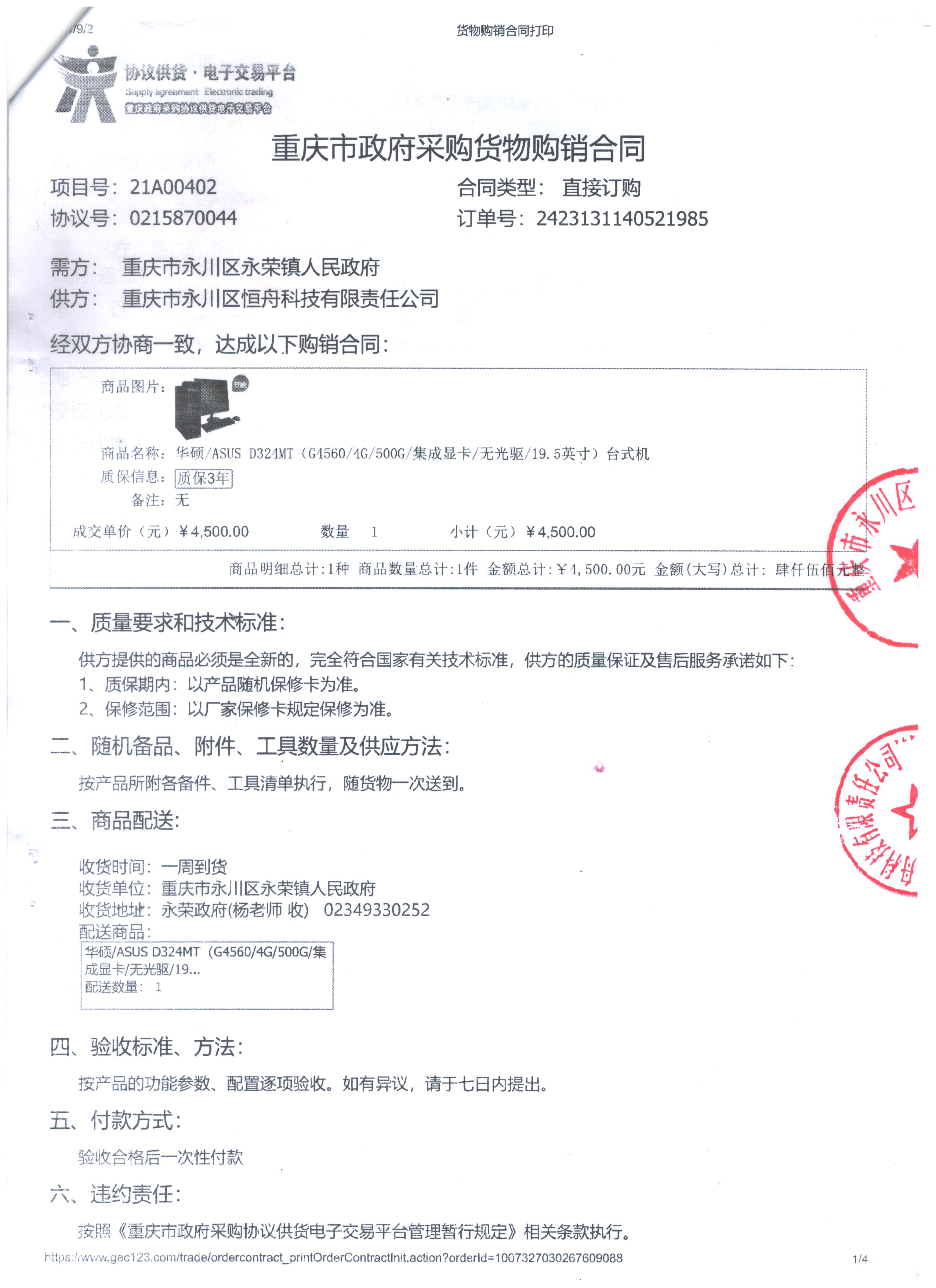 21A00402 | 重庆市永川区永荣镇365网站是正规平台吗_365bet足球网_bt365博彩 | 重庆市永川区恒舟科技有限责任公司 | 2021年职工养老保险专项电脑采购 | 台式计算机 | 1 | 2021/9/23 | 电子协议供货 | 4,500.00 | 集中采购 | 自行实施 |